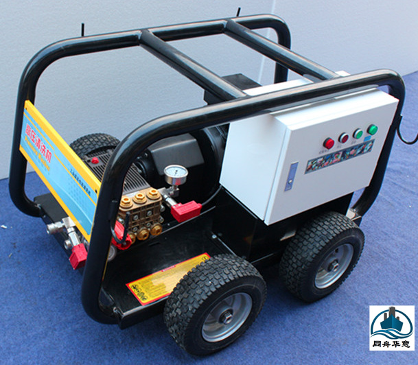小區管道電驅動疏通機$r$n移動式下水道清洗機用于疏通、清除管道中的堵淤和污物。它以汽油機或電機為動力驅動高壓泵運轉,利用高壓水射流在噴頭上產生的推進力疏通管道。當噴頭到達管端時,高壓水后作用力清掃管壁并將雜物帶至管外,以達到清洗管道的目的。是現代化生產必備的清洗設備。特別適合市政、環衛部門清洗、疏通市政管道。